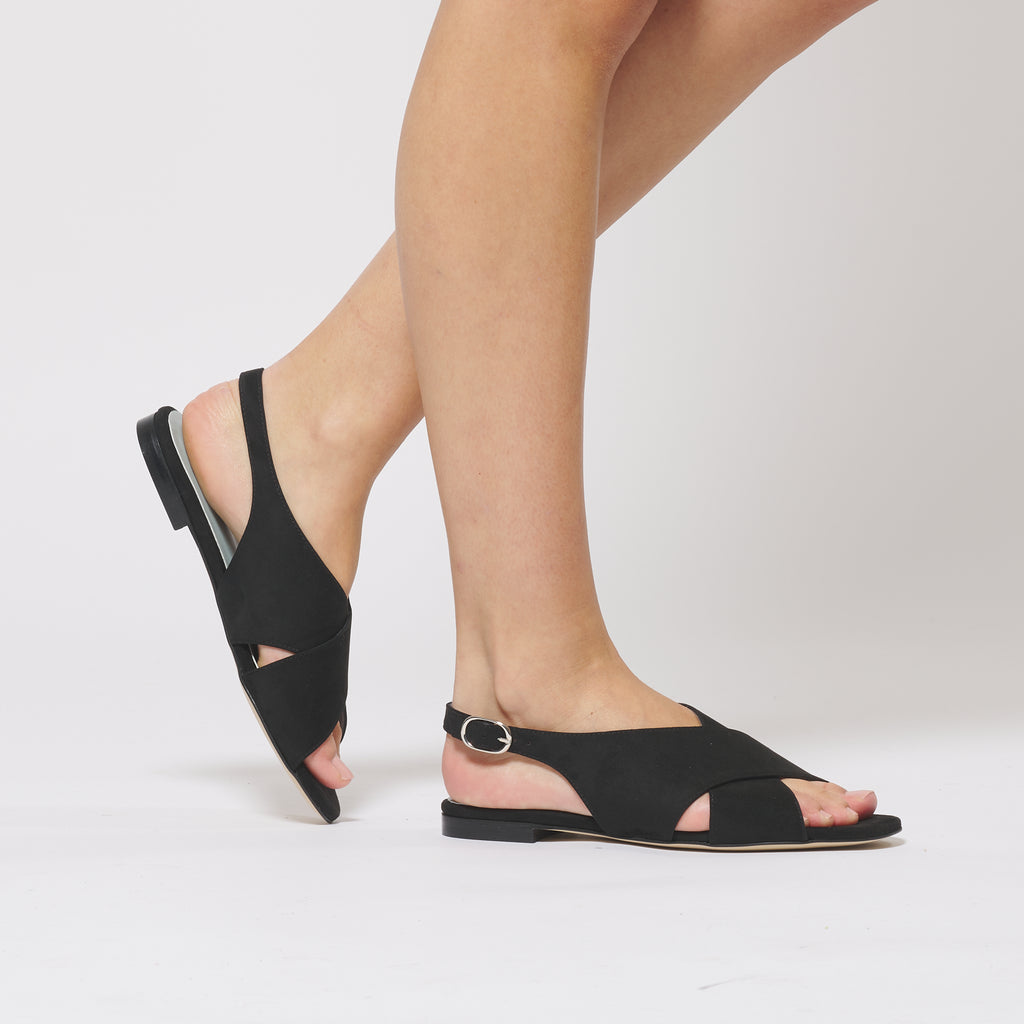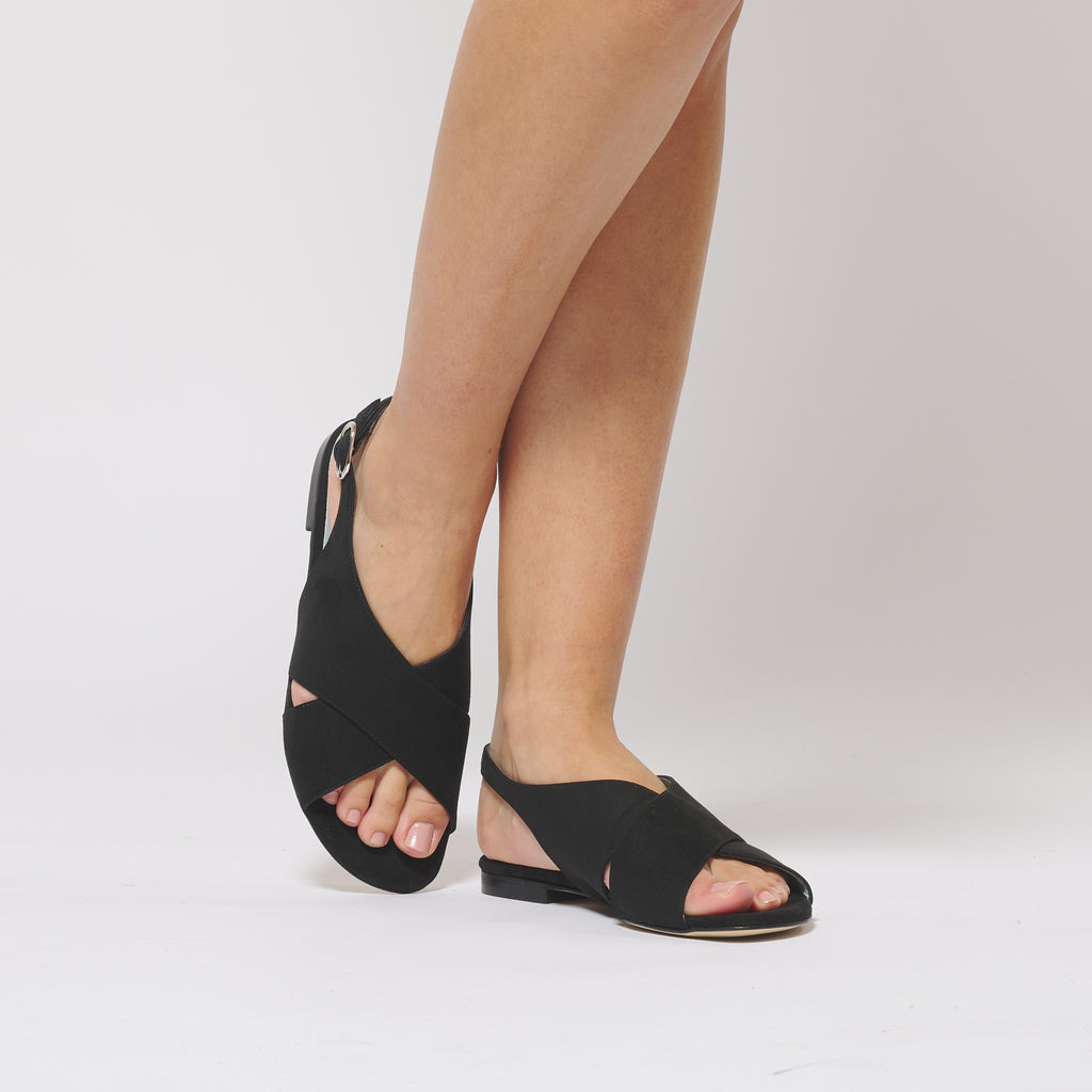 Sandales basses en daim vegan noir - Confortables tout en restant raffinées avec son jeu de brides croisées.
