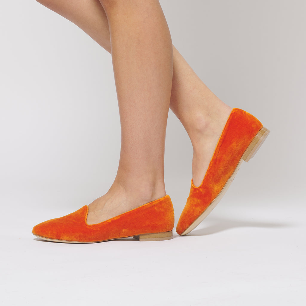 Slippers en velours orange "Zucca" d'Italie - inspirés du chausson de Venise, à porter en toute circonstances. La semelle est faite avec des matériaux recyclés.